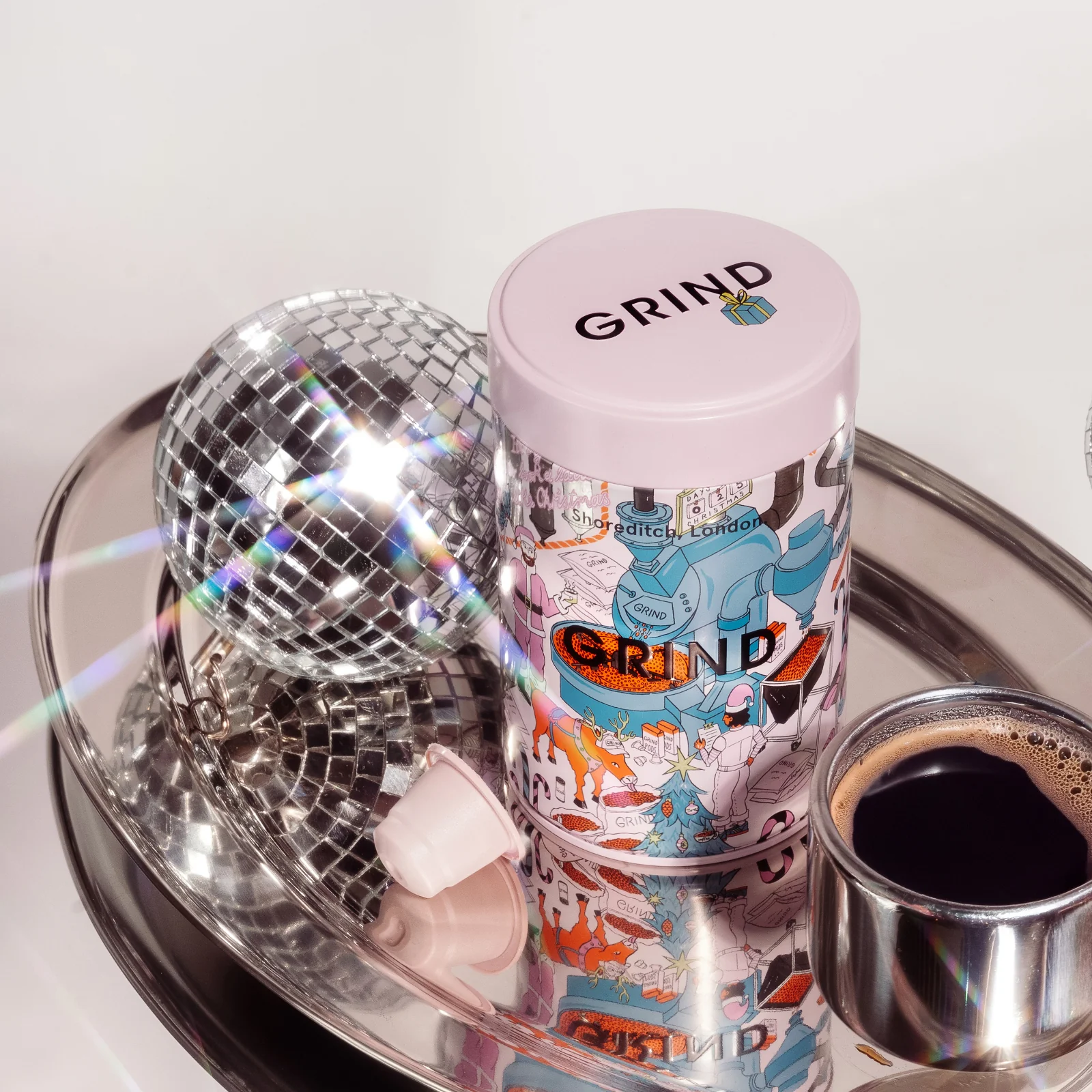 Featuring a festive illustration of the Grind Grotto (our Bermondsey roastery), our new Christmas Tin comes with 20 Nespresso® compatible compostable coffee pods in the blend of your choice.
