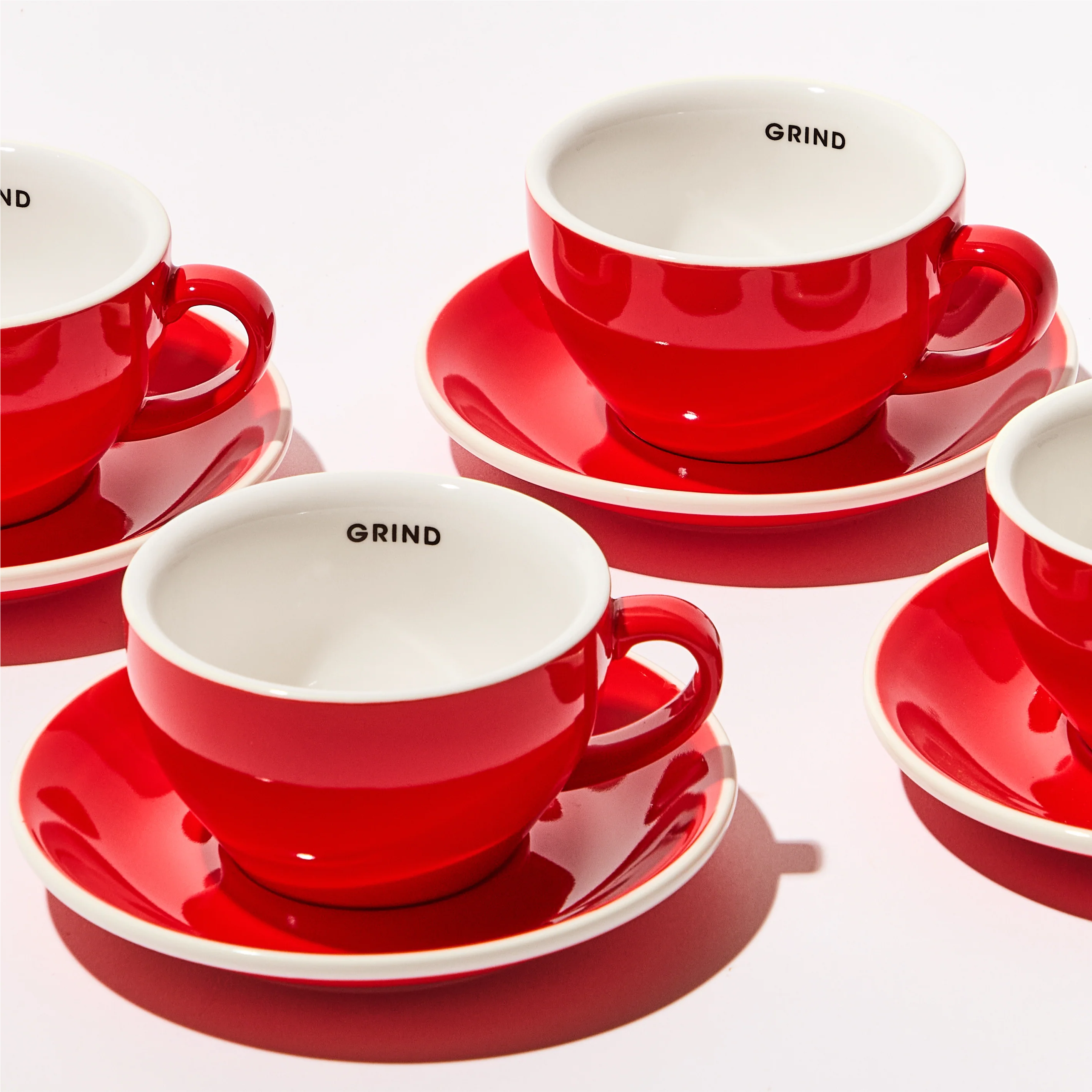 Our classic red coffee cups and saucers, just like those used across all the Grind cafés.